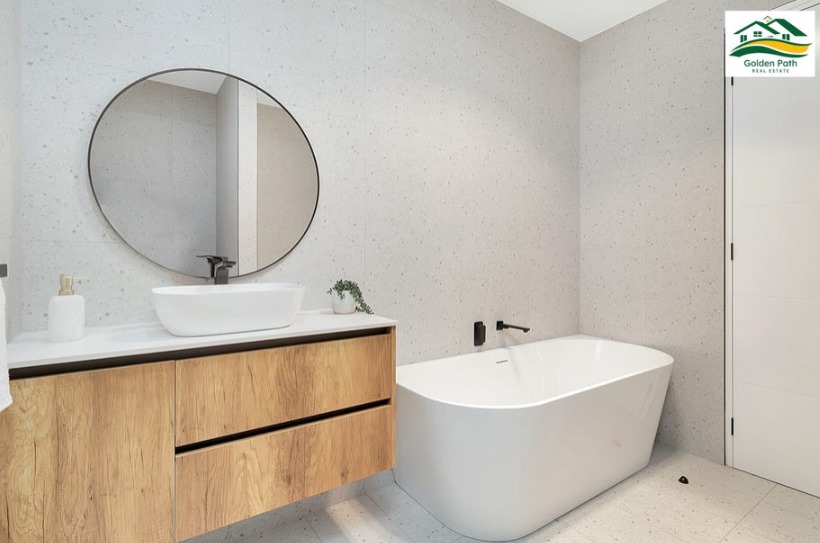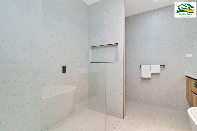 The living area is enhanced by stylish internal cladding, adding texture and character to the space. Both bathrooms are designed with modern features, boasting floor-to-ceiling tiles for a sleek, contemporary look. Indulge in relaxation with a luxurious freestanding bathtub, creating a spa-like experience in the comfort of your own home.